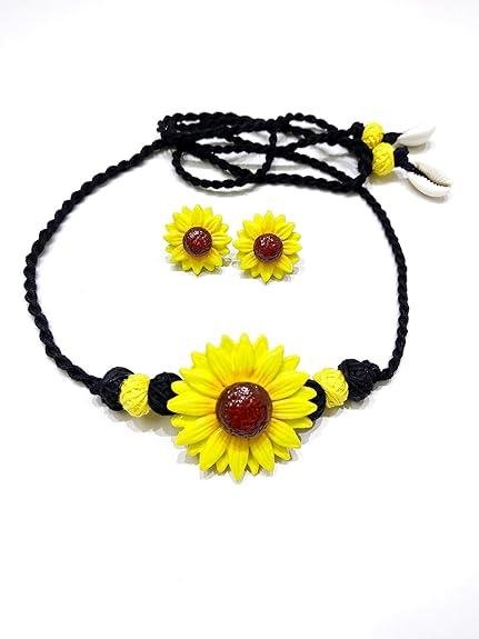 DHALI HOUSE Sunflower Clay Jewelry Set | Handmade Necklace with Black Braided Cord and Matching Earrings | Traditional Indian Artificial Jewelry for Women and Girls (Yellow-Black)