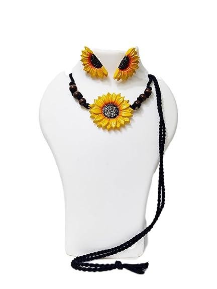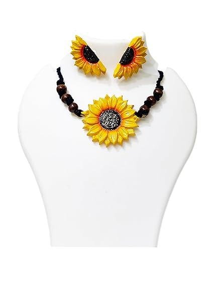 Handcrafted Elegance: Beautifully handmade sunflower clay jewelry set with a detailed necklace and matching stud earrings, ideal for adding a touch of nature-inspired charm.