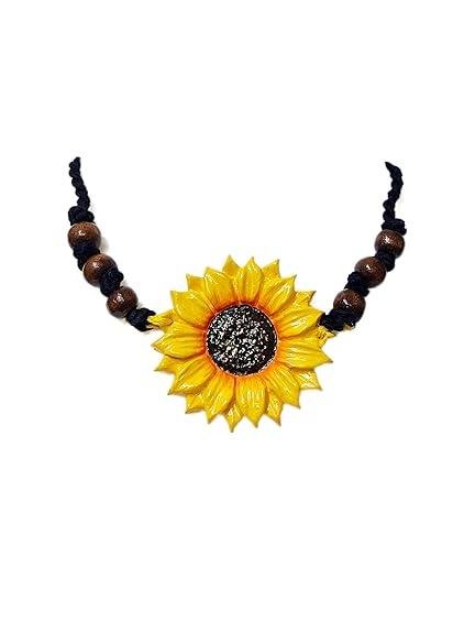 Eye-Catching Necklace: Features a yellow sunflower pendant with a textured brown center, strung on a black cord with wooden beads for a rustic and bohemian look.