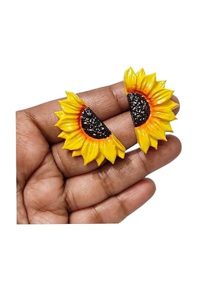Charming Earrings: Includes coordinating half-sunflower stud earrings with bright yellow petals and a dark textured center for a cohesive, stylish set.