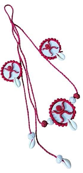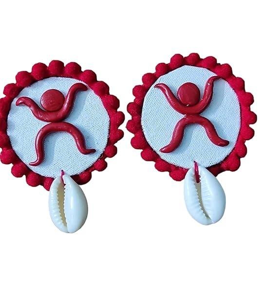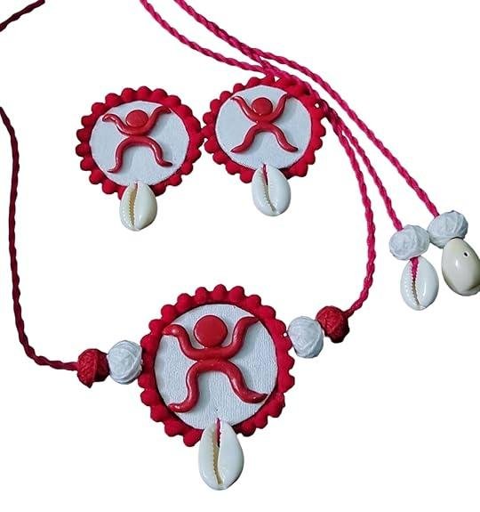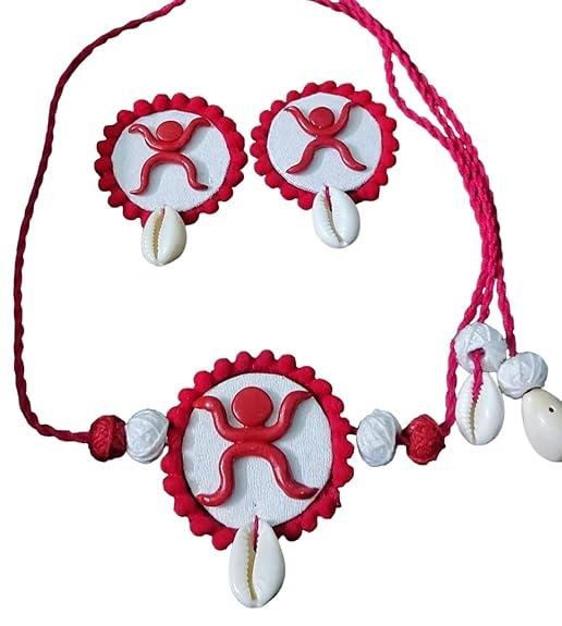Handmade Clay Jewelry: Exquisite Swastik design jewelry set crafted from clay, fabric, cotton thread, cotton balls, and seashells - a beautiful representation of traditional Indian craftsmanship.