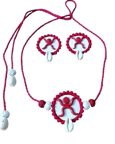 DHALI HOUSE Swastik Design Clay Jewelry Set | Handmade Cotton Thread Necklace with Matching Earrings | Traditional Indian Artificial Jewelry for Women and Girls (Red)